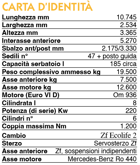 Caratterizzato da una massa massima di 19500 kg nella versione ibrida, l’Intouro hybrid presenta sospensioni anteriori Zf Rl75E a ruote indipendenti e un ponte posteriore Mercedes-Benz Ro440 con un rapporto al ponte di 5,222:1.