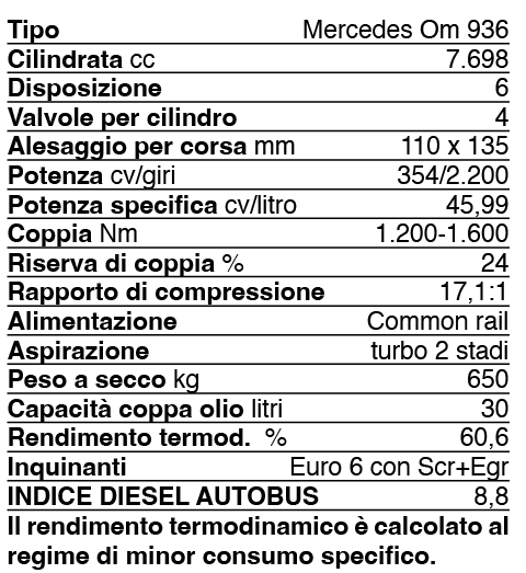 Il motore elettrico supporta inoltre il Diesel quando gira al minimo, permettendo un ulteriore risparmio energetico e di carburante. Capace di erogare una potenza di 19 kW e una coppia di 220 Nm, il motore elettrico risulta particolarmente vantaggioso nelle situazioni caratterizzate da traffico e frequenti fermate e ripartenze, incrementando l’efficienza energetica e portando una riduzione dei consumi dichiarata fino al 5 per cento. Non interviene, invece, per aumentare la potenza o la coppia massima, che rimangono le stesse del corrispondente motore termico a 6 cilindri da 7,7 litri, rispettivamente di 354 cavalli a 2200 giri e 1400 Nm a 1200-1600 giri.