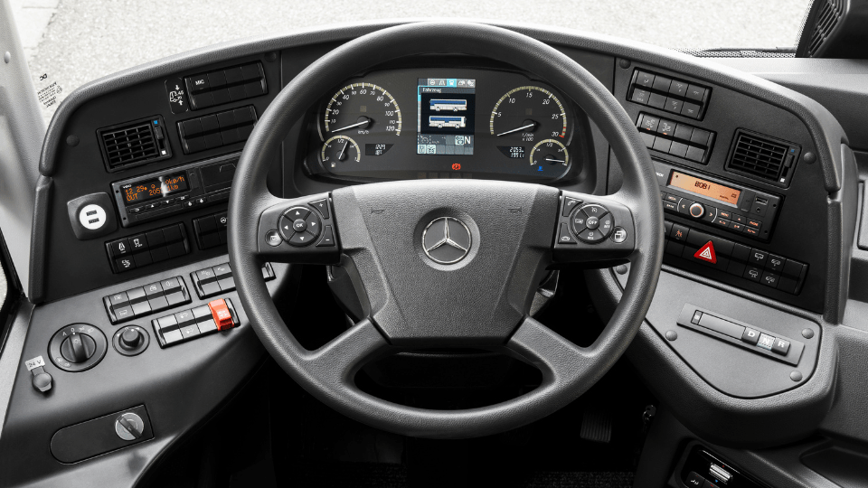 Il posto di guida è ergonomico, caratterizzato da funzionalità e qualità dei materiali e dell’assemblaggio. Il volante multifunzione può essere regolato in un’ampia gamma di posizioni tanto longitudinalmente quanto in altezza, incontrando le esigenze di autisti di ogni corporatura, senza tuttavia interferire con la leggibilità degli strumenti, ampi e ben visibili. Anche il sedile di guida Isringhausen Nts2 offre numerose possibilità di regolazione, è riscaldabile e dotato di braccioli ripiegabili su entrambi i lati e di supporto lombare. Gli specchi esterni, ampi e ben visibili, sono montati su semplici elementi tubolari che consentono una veloce ed economica sostituzione in caso di bisogno. La postazione del conducente è fisicamente separata dal compartimento passeggeri mediante un’antina trasparente che, sebbene non possa garantire una protezione dell’incolumità dell’autista in caso di aggressione, assicura comunque un opportuno isolamento acustico e funzionale. Il posto guida, peraltro, è dotato di un sistema di aerazione e climatizzazione indipendente e separato da quello dei viaggiatori e di due prese USB per la ricarica di piccole apparecchiature elettroniche. A fianco dell’autista è già predisposto un tubolare per il montaggio delle apparecchiature di bigliettazione, con relativo attacco per il sistema di pagamento.