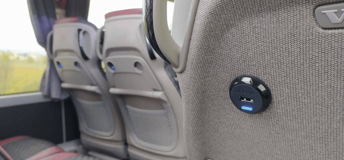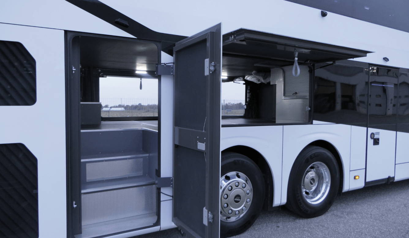 Il sistema di Infotainment Bosch, comandato tramite un display da 6,5 pollici, si avvale di quattro monitor per la zona passeggeri, distribuiti due per piano. Due microfoni differenti sono al servizio, rispettivamente, del conducente e della hostess. Quest’ultima ha a disposizione anche un attacco Hdmi.