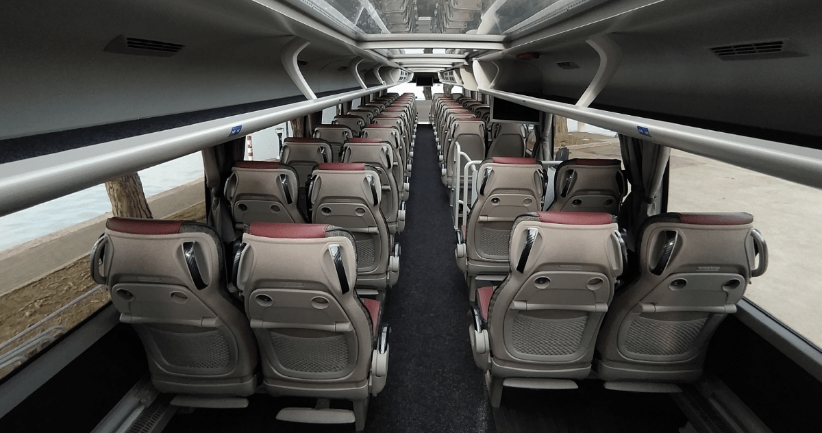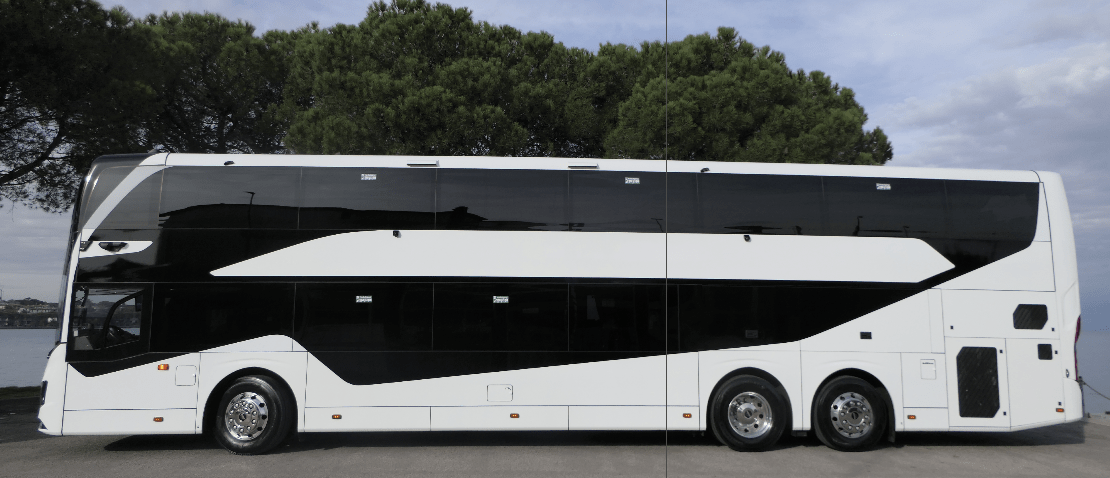 La versione per l’Italia prevede 87 posti a sedere, tutti dotati di braccioli pieghevoli, schienale reclinabile, tavolino e prese Usb. Al piano inferiore, sopra l’asse anteriore, sono stati ricavati due ampi mobiletti destinati in parte ad alloggiare parte dell’impianto elettrico, e in buona parte impiegabili come portaoggetti di varie capienze, tutti dotati di serratura a chiave. Ampio e confortevole, il bagno permette di muoversi agevolmente al suo interno avendo anche a disposizione dei piccoli appoggi per gli effetti personali. Al piano superiore, l’elemento che colpisce è sicuramente il tetto panoramico che corre per tutta la lunghezza del padiglione. Purtroppo, almeno nella fase iniziale, non è previsto per la versione destinata all’Italia. La climatizzazione è affidata a un potente impianto quadrizona a convettori, con defroster specifico per l’area del conducente.