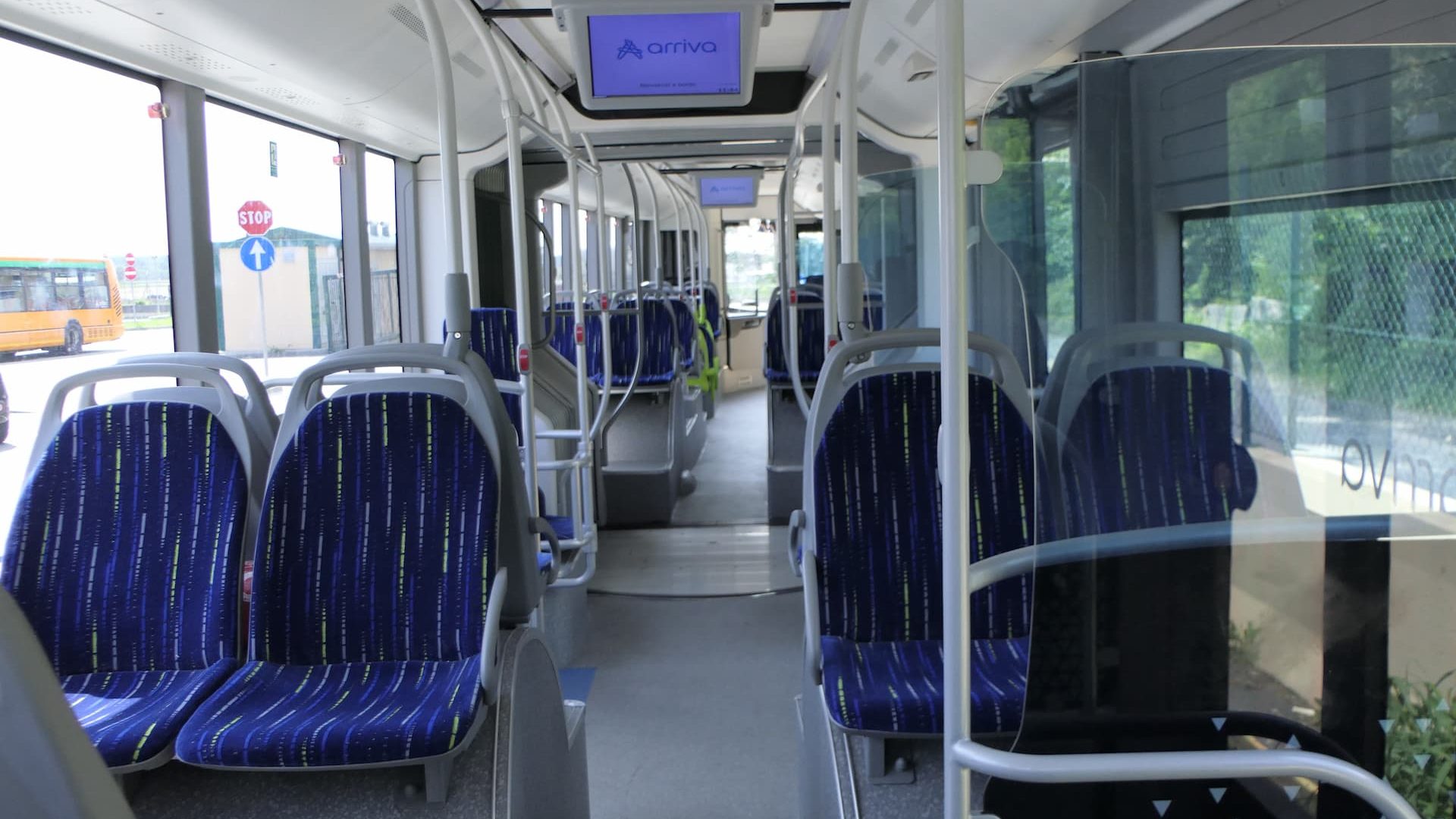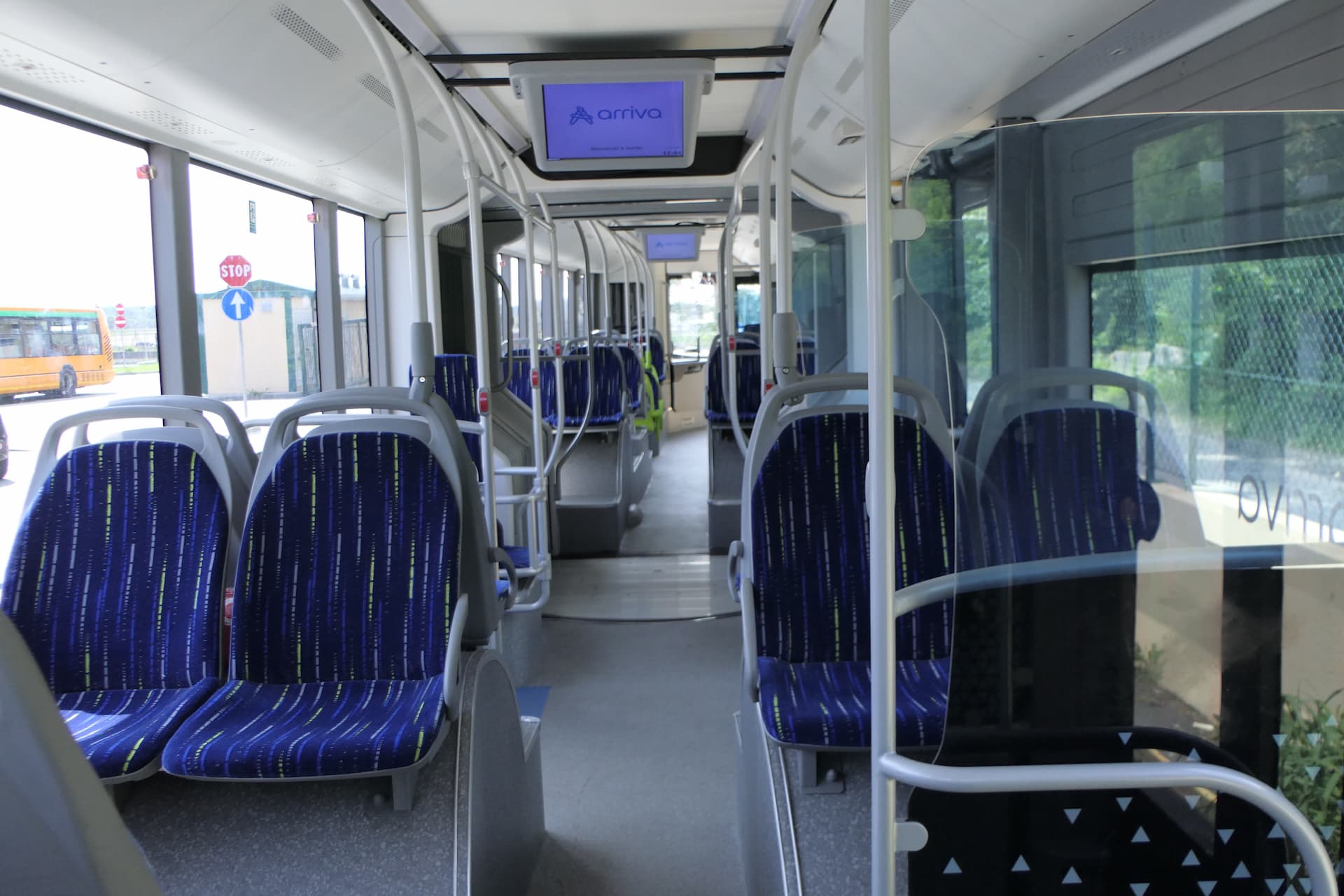 Il pianale è completamente ribassato, fatta eccezione per un ‘podio’ che occupa la porzione sinistra del posteriore ed è accessibile mediante due gradini. Una configurazione che, seppur mantenendo razionalità, provoca un certo restringimento del corridoio in corrispondenza con la porta posteriore. Posteriore che è occupato da un’ampia superficie vetrata, consentita dalla disposizione dei pacchi batteria. Un particolare che giova al conseguimento della già citata buona luminosità interna. Rispetto all’allestimento standard, le uniche specifiche aggiunte sono rappresentate dai due monitor per le informazioni ai passeggeri. Presenti nell’abitacolo anche alcune prese usb alloggiate nelle paretine laterali.