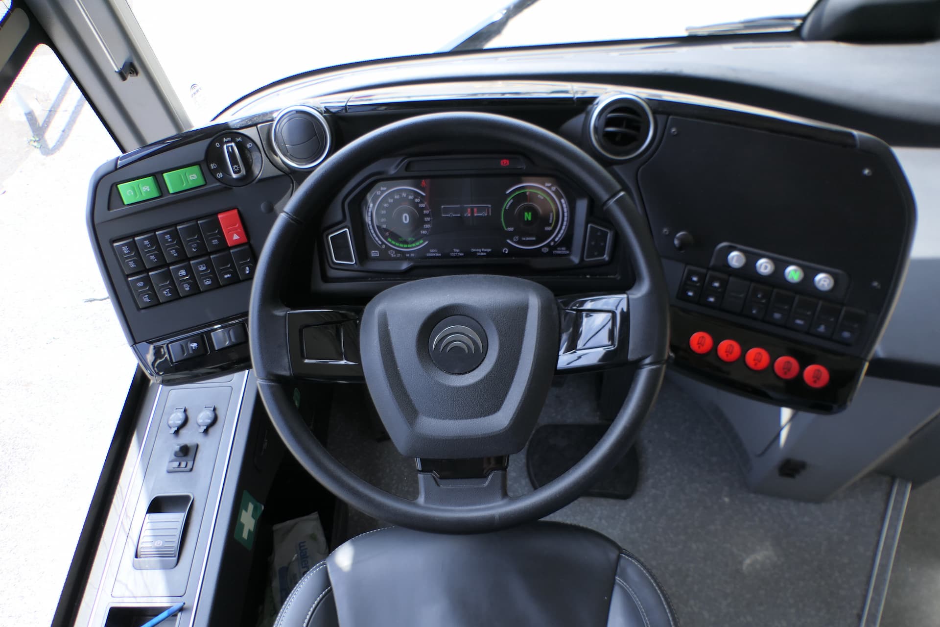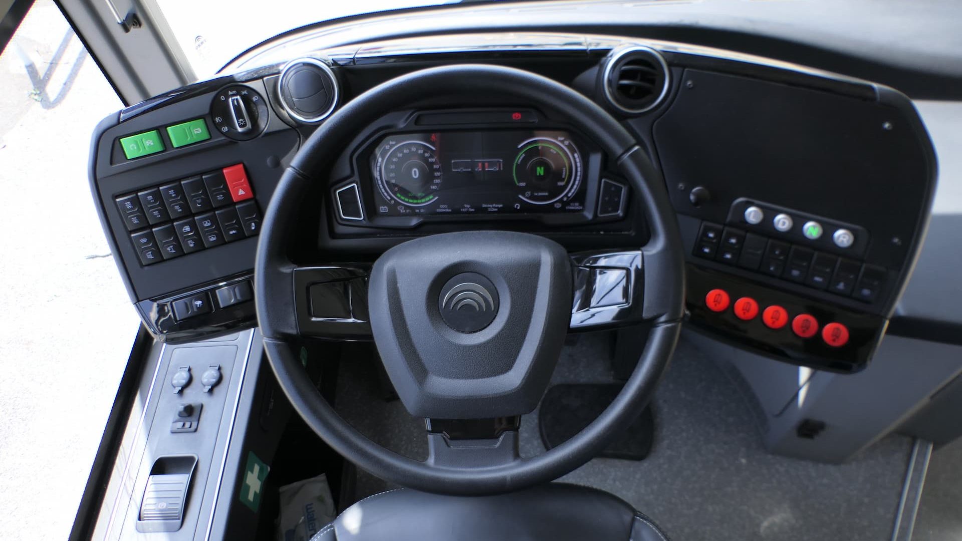 Nel complesso la postazione di guida è confortevole ed ergonomica, tuttavia, una cosa che colpisce in maniera negativa è la dimensione eccessivamente ridotta dei caratteri sul display digitale: se i quadranti sono ancora leggibili, lo stesso non si può dire degli altri indicatori, compreso quello, importantissimo, relativo alla percentuale di carica della batteria e all’autonomia. Purtroppo, complice l’aumento dell’età media del personale di guida, l’ipermetropia è una realtà di cui tenere conto: un carattere troppo piccolo richiede, nel migliore dei casi, un adattamento della messa a fuoco che potrebbe avere risvolti potenzialmente critici in caso di emergenza.