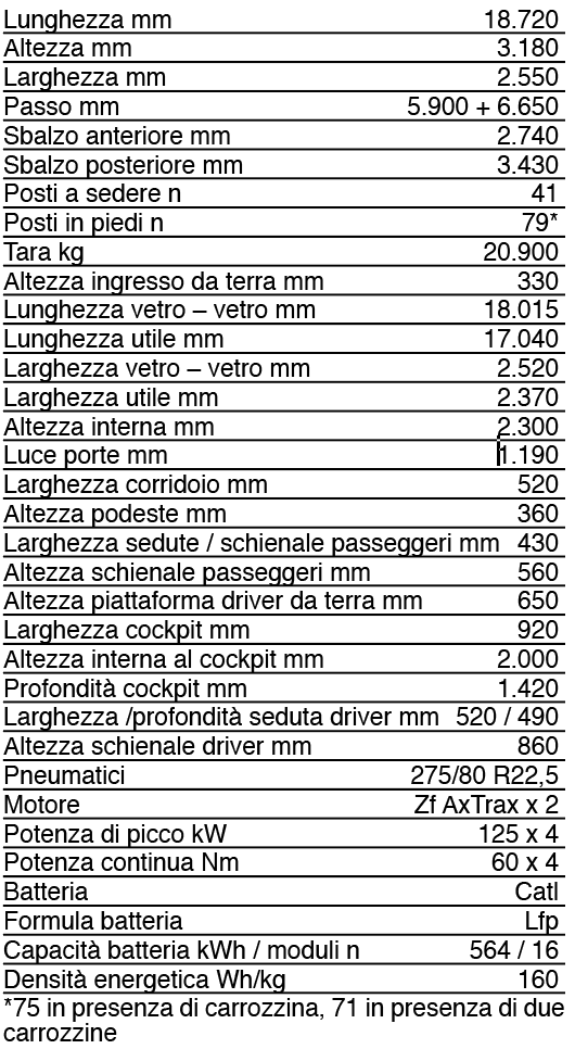 41 le sedute, a cui si aggiunge spazio in piedi per un massimo di 79 passeggeri, o 75 in presenza di carrozzella o ancora 71 in caso di coabitazione a bordo di due carrozzelle.