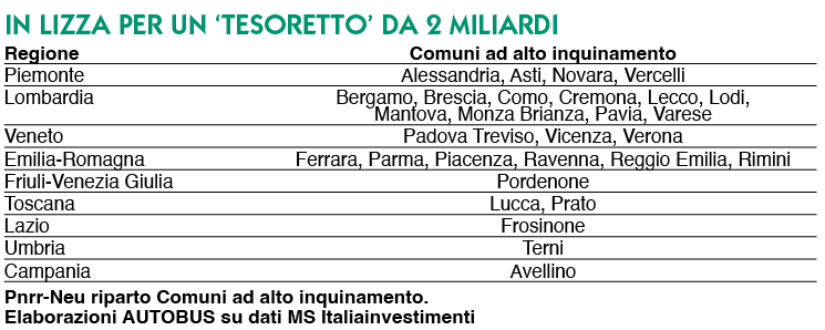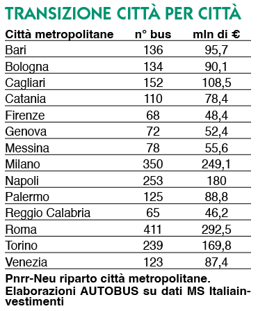 Gli 1,915 miliardi messi a disposizione di città metropolitane, capoluoghi e comuni ad alto inquinamento sono da contrattualizzare entro il 31 dicembre 2023 e sono destinati esclusivamente a bus urbani (e alla relative infrastrutture) elettrici e a idrogeno. Partendo dalle città metropolitane, e facendo l’elenco in ordine alfabetico ecco Bari (136 bus; 95,7 milioni di euro), Bologna (134 bus; 90,1 mln), Cagliari (152 bus; 108,5 mln), Catania (110 bus; 78,4 mln), Firenze (68 bus; 48,4 mln), Genova (72 bus; 52,4 mln), Messina (78 bus; 55,6 mln), Milano (350 bus; 249,1 mln) Napoli (253 bus; 180 mln), Palermo (125 bus; 88,8 mln), Reggio Calabria (65 bus; 46,2 mln), Roma (411 bus; 292,5 mln), Torino (239 bus; 169,8 mln) e Venezia (123 bus; 87,4 mln).