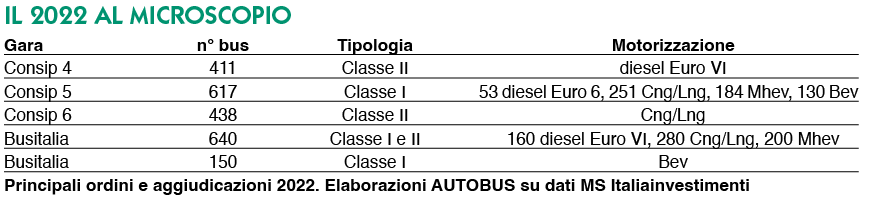Quali sono stati i principali ordini e aggiudicazioni nel corso del 2022? Presto detto. Iniziamo con la gara Consip 4 per l’aggiudicazione di 411 extraurbani motorizzati diesel Euro VI. Dunque Consip 5 per 617 Classe I, di cui 43 diesel Euro VI, 252 Lng/Cng, 183 mild hybrid e 130 mezzi full electric. Quindi Consip 6 per 438 pezzi Classe II, tutti a gas e biogas, sia compresso che liquefatto. Per le gare Consip emerge come la scelta delle aziende sia stata multitecnologica e multienergetica.