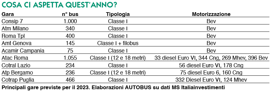 Per il 2023 in corso si prefigura un’accelerazione importanze sugli autobus elettrici (ma non solo), grazie anzitutto alla gara Consip 7, per mille autobus a batteria e filobus di ultima generazione, con tecnologia In motion charging. A seguire i tre lotti di Atm Milano, per un totale di 340 unità urbane elettriche. Ci aspettiamo anche 400 macchine, sempre a batteria, Classe I per Roma Tpl. Dunque Amt Genova: 145 pezzi elettrici tra bus e filobus; sono invece 75 le unità della gara di Acamir Campania, per Bev urbani ‘corti’. La maxi gara di Atac Roma consiste in un totale di 1.055 autobus urbani da 12 e 18 metri (di cui 755 per il Giubileo 2025), così suddivisi: 33 diesel Euro VI, 344 Cng, 269 mild hybrid e 396 elettrici. Sono invece 234 gli extraurbani per Cotral in Lazio, 56 diesel Euro VI e 178 Cng, mentre Atp Bergamo prevede l’ingresso di 236 mezzi urbani da 12 e 18 metri, di cui 75 diesel Euro VI e 160 Cng. Infine, la massicca gara di Cotrap in Puglia: 466 extraurbani, 332 diesel Euro VI e 124 ibridi leggeri.