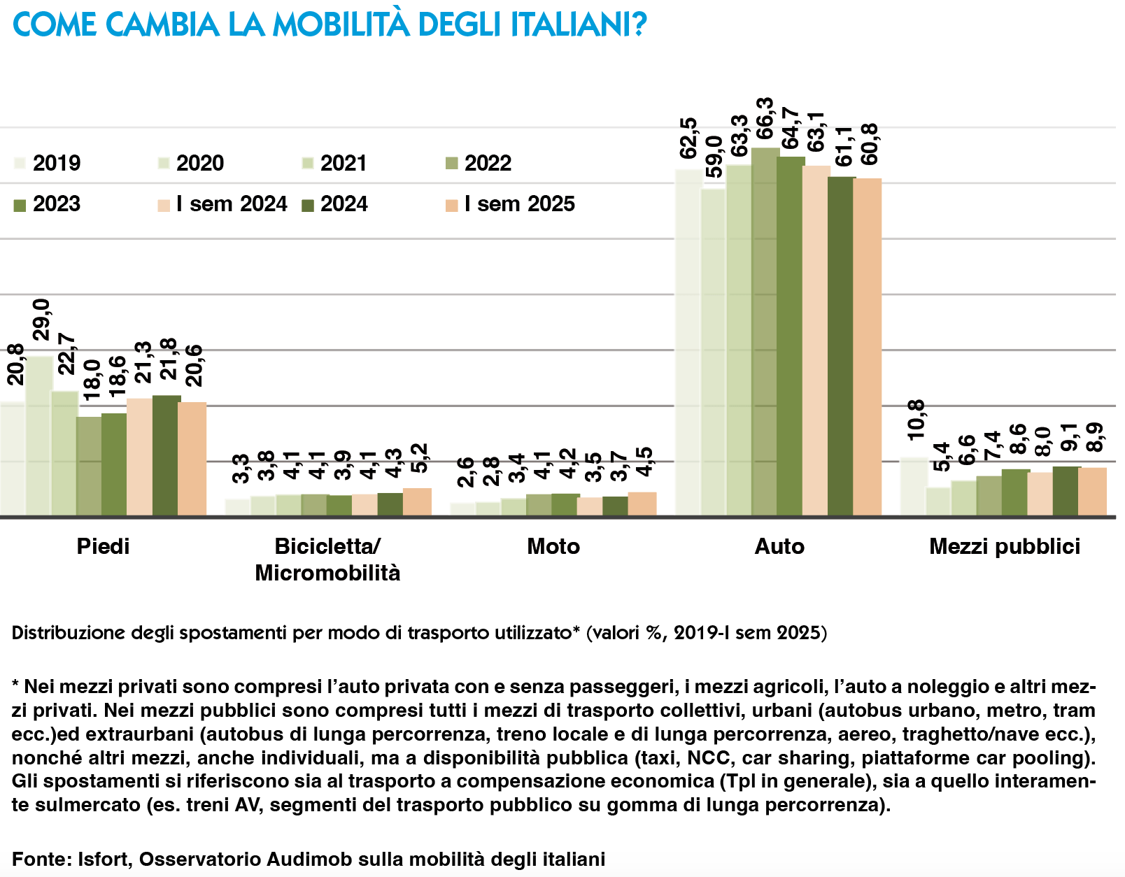 Il trasporto pubblico locale mostra segnali di recupero, ma non ha ancora colmato il gap pre-Covid. Nel primo semestre del 2025 la quota modale dei mezzi pubblici è intorno al 9 per cento (8,9 per l’esattezza), contro oltre il 10 per cento del 2019 (ma comunque più alta dell’8 registrato nel 2024).