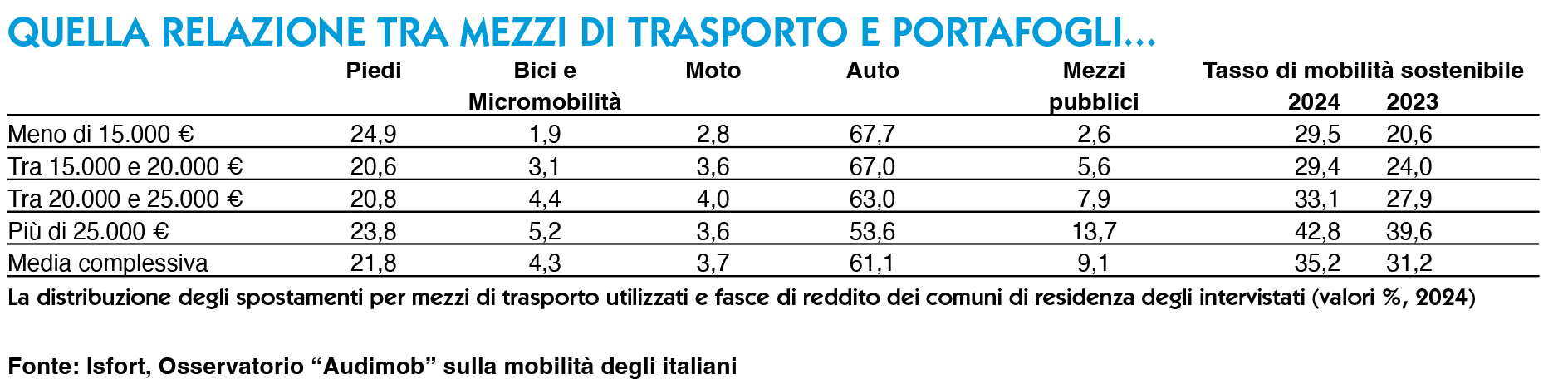 Uno dei dati più critici del rapporto riguarda l’intermodalità. Gli spostamenti che combinano più mezzi restano marginali: 2,8 su cento, in calo rispetto al 2024 e meno della metà del livello 2019. L’intermodalità funziona solo: nelle grandi città, specialmente nel nord ovest. Il resto dello Stivale balbetta…