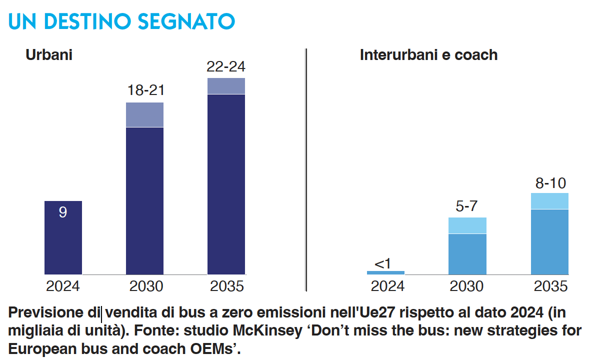 Come noto, la spinta verso la decarbonizzazione sta plasmando le strategie di produttori e operatori pubblici. Altrettanto noto è l’obiettivo: un continente a neutralità di emissioni di carbonio nel 2050. McKinsey stima che, solo per gli autobus urbani, le vendite annue di veicoli a zero emissioni debbano raddoppiare entro il 2030, passando dalle 9mila unità del 2024 fino a raggiungere una cifra nella ‘forchetta’ tra 18 e 21mila pezzi nel 2030.