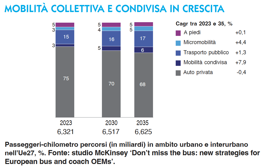 Secondo McKinsey, la quota di spostamenti coperti dal trasporto pubblico (passeggeri/km) è destinata a salire dal 15 per cento del 2023 al 17 entro il 2035, con un parallelo calo dell’uso dell’auto privata, che passerebbe da 75 a 68 punti percentuali. Un trend alimentato da politiche urbane che incentivano la mobilità condivisa e scoraggiano l’uso dell’auto privata, oltre che dall’adozione crescente di soluzioni di micromobilità e trasporto condiviso. Guardando al tasso di crescita annuo dei vari segmenti (Cagr), gli analisti individuano una crescita del +4,4 per cento per la micromobilità e del +7,9 per cento per la shared mobility (comprese le soluzioni autonome), mentre per il tpl si prospetta un discreto +1,3 per cento.