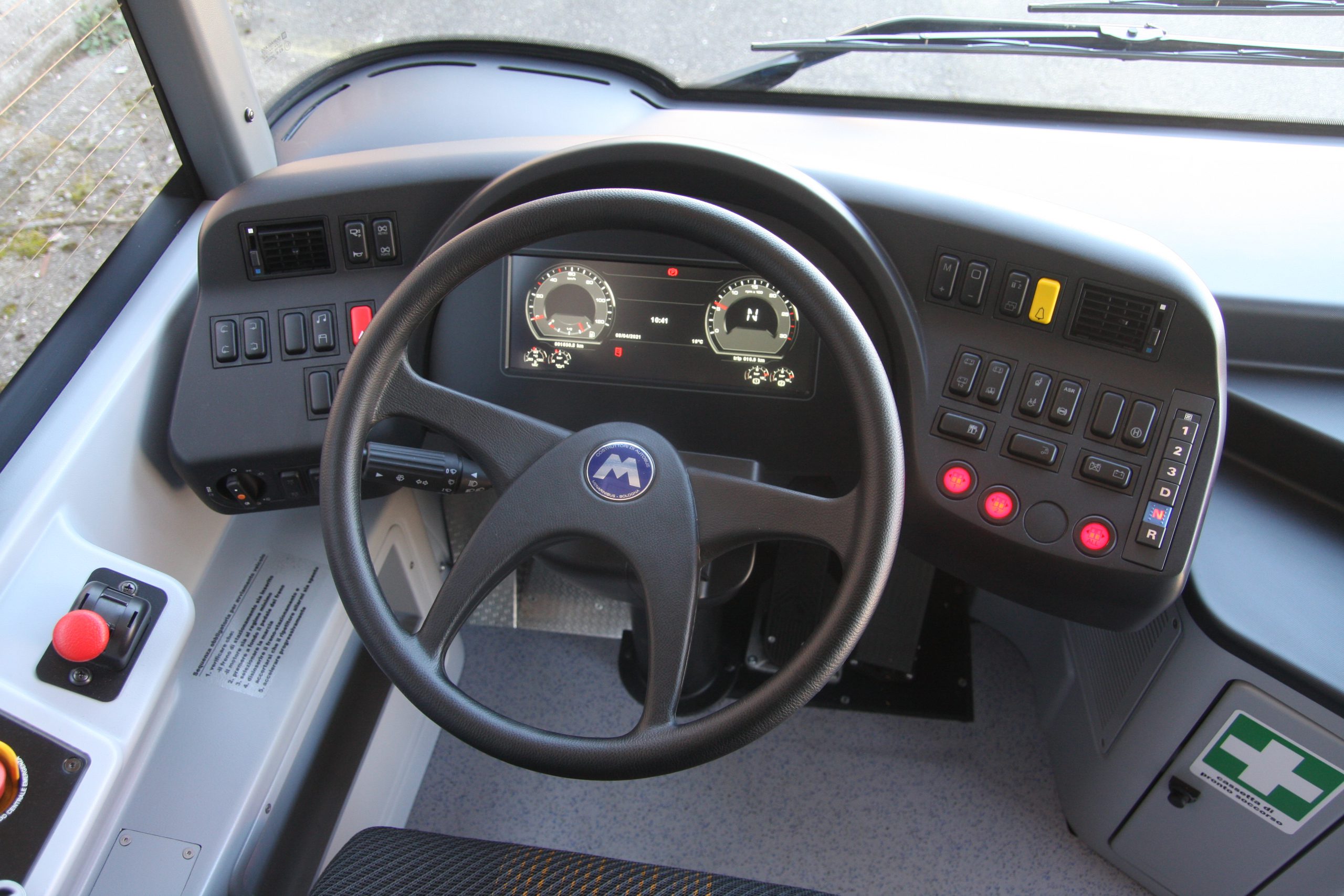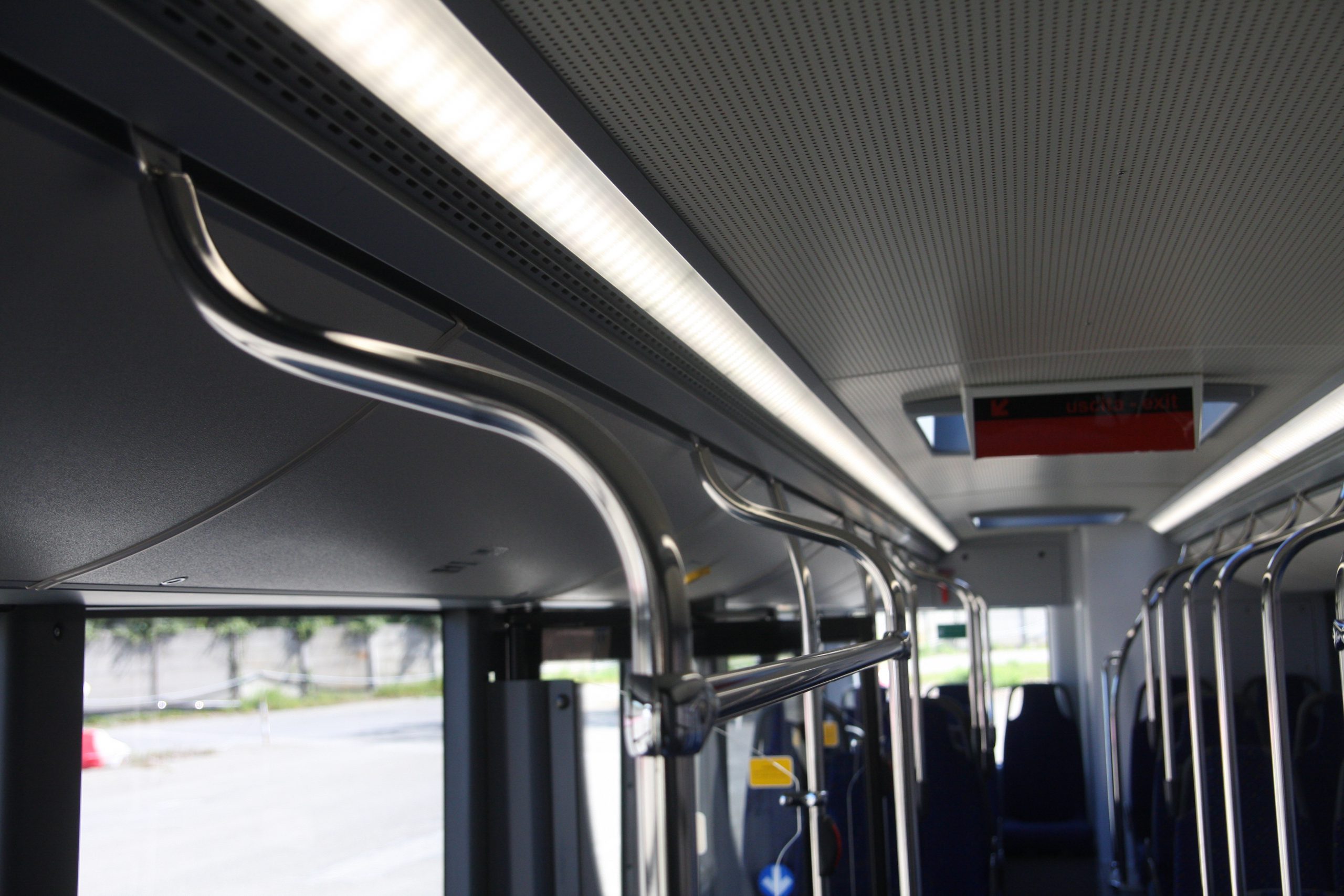Saltano all’occhio i mancorrenti, dal pregevole design: a differenza del nero standard, nella versione provata sono in colore acciaio e presentano sinuose curvature nella parte di congiunzione al soffitto del bus, dove sono ‘affogate’ longitudinalmente due file di led che presiedono all’illuminazione interna del mezzo. Previste luci azzurrate per le prime due luci, in modo da ridurre il disturbo visivo nelle ore notturne, con comando di accensione a tre stadi.
