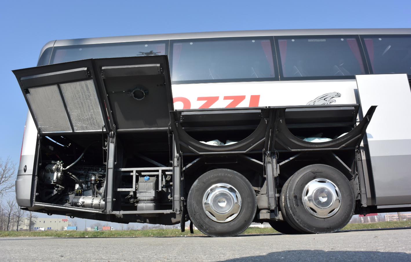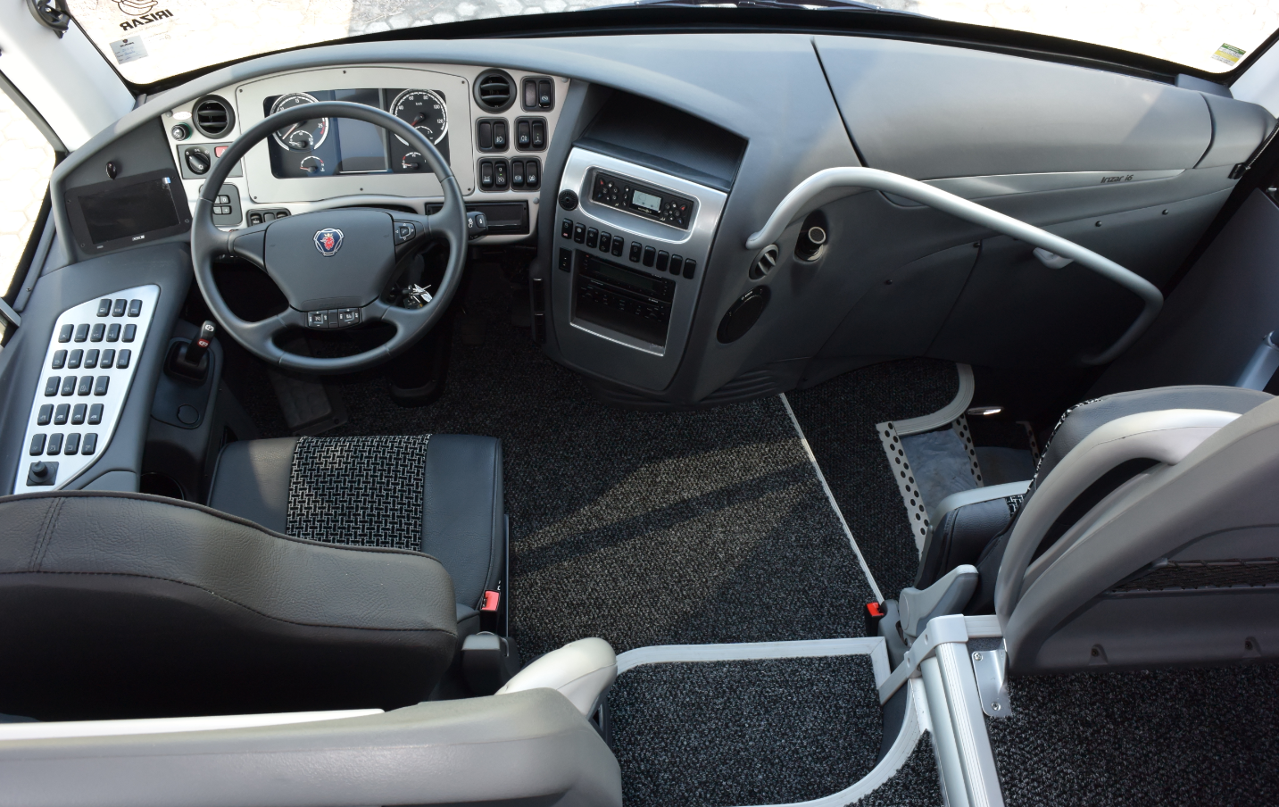Il tre assi per Marozzi conta all’interno 59 sedute. Si tratta di poltrone, come già accennato, ereditate dal Pb, insomma quelle top caratterizzate dalla doppia imbottitura, fascia perimetrale e poggiatesta in pelle e corpo centrale in tessuto. Poltrone, realizzate in house dalla stessa Irizar, tutte reclinabili, allargabili ed equipaggiate con i classici braccioli e poggia piedi abbattibili e presentano, sul posteriore, la retina portaoggetti e un piccolo cestino per ogni biposto. Le cappelliere sono di tipo aperto con l’eccezione di due piccole porzioni anteriori utilizzate di norma dall’autista. Eleganti i service set che qui sono ‘aggrappati’ a una fascia in materiale plastico (tinta su tinta)…
