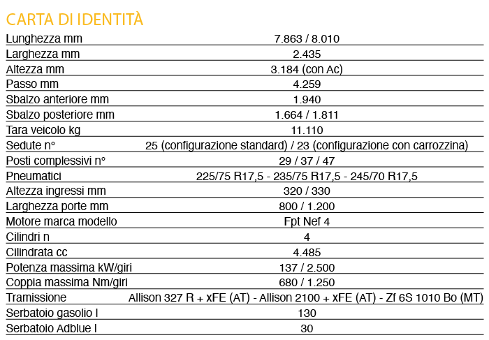 La coppia massima è di 680 Newtonmetro, in questo caso sviluppati a 1.250 giri. Trasmissione automatica o manuale: nella versione standard, il cambio automatico è firmato Allison, modello 3270R, mentre opzionalmente è possibile sfruttare il 2100 Allison, oppure il cambio manuale Zf 6S 1010 Bo. In ogni caso, sono sei le marce in avanti più la retromarcia. Anteriormente e posteriormente lavorano sospensioni ad aria, con due soffietti e due ammortizzatori idraulici che raddoppiano spostandoci sull’asse posteriore.