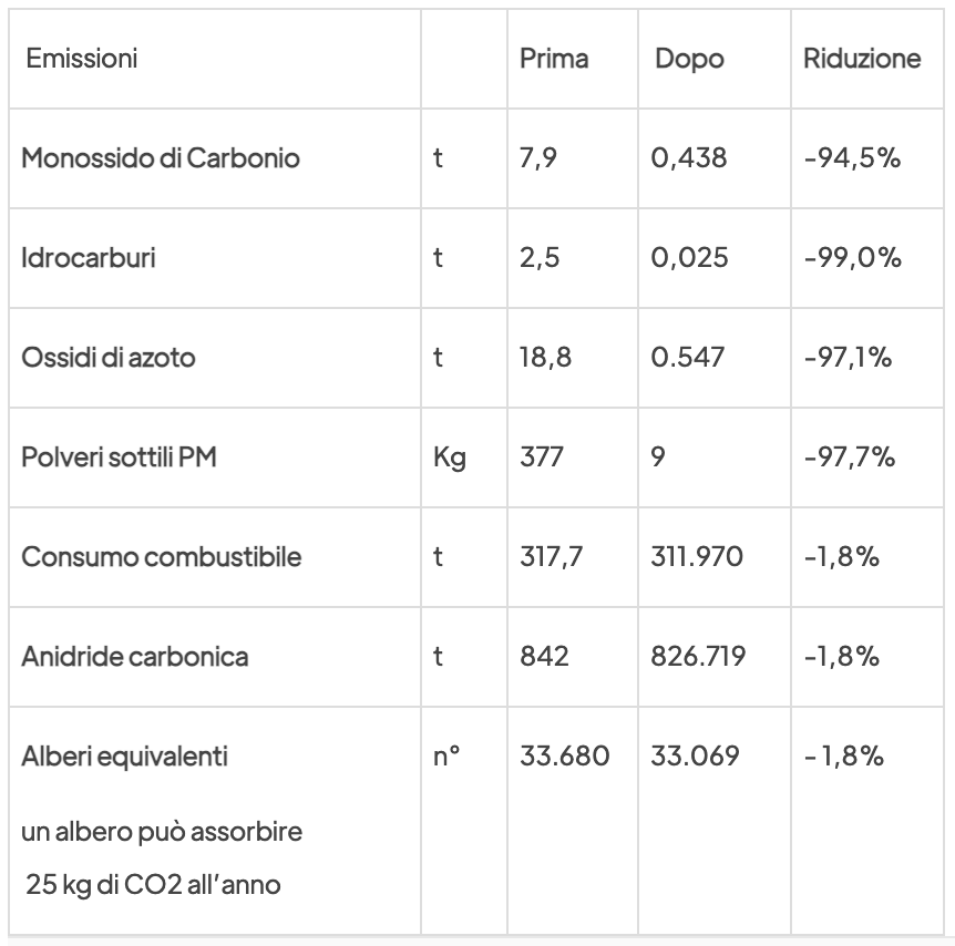 La riduzione dell’impatto ambientale risulta significativa poiché i mezzi vanno a sostituire autobus di vecchia generazione (Euro 3). Pertanto da subito si avrà una riduzione superiore al 90% nelle emissioni di idrocarburi, polveri sottili e dei principali inquinanti in atmosfera. La riduzione di anidride carbonica, nonostante si tratti comunque di mezzi ad alimentazione diesel, è pari ad un bosco di oltre 600 grandi alberi che oggi metaforicamente sono stati piantati nella piazza di Castelfranco Veneto.