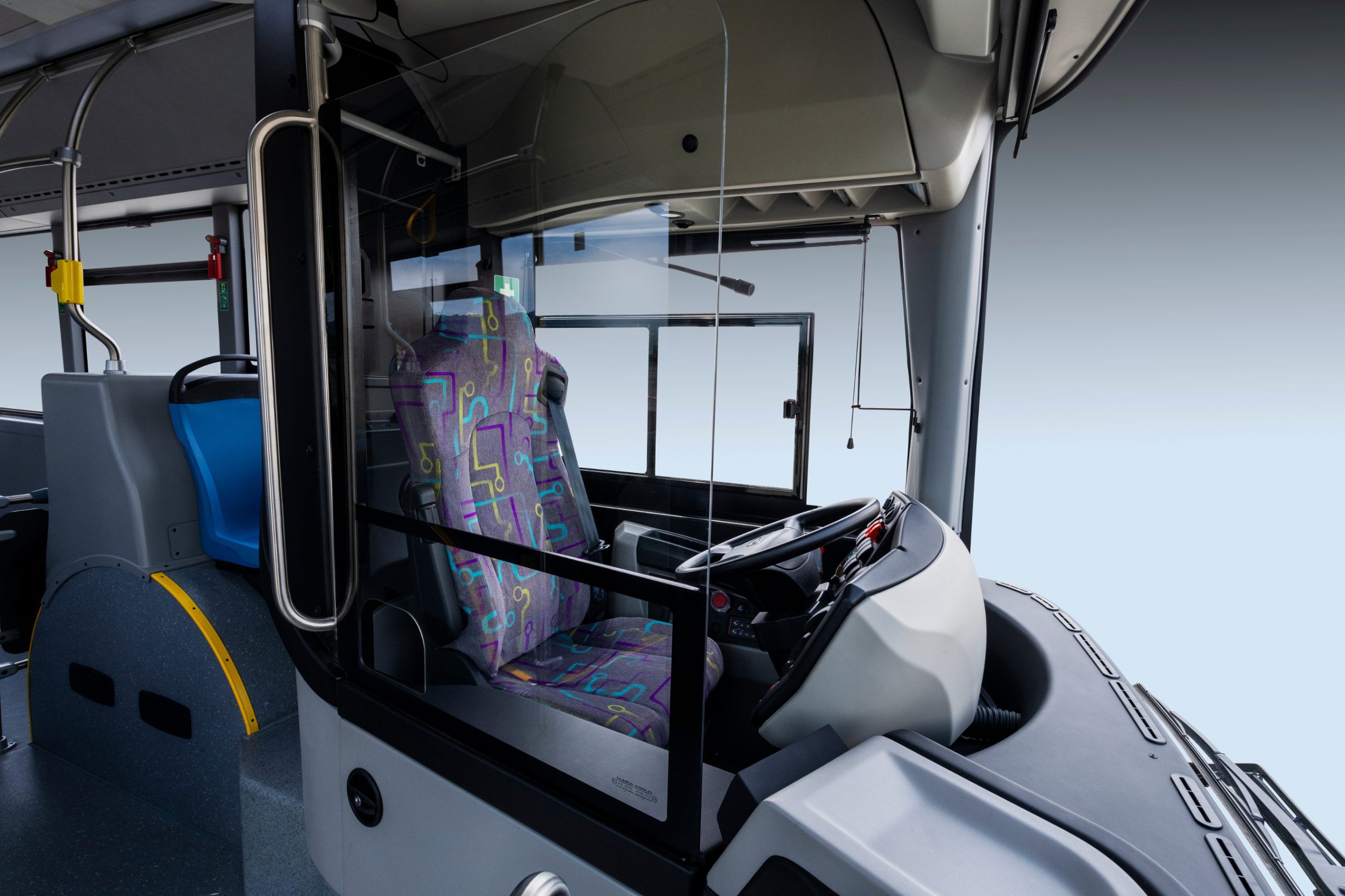 Il posto autista include uno sportello vetrato e un vano porta oggetti posizionato in alto. È dotato di sterzo regolabile e di un cluster Actia Multic S.digital.