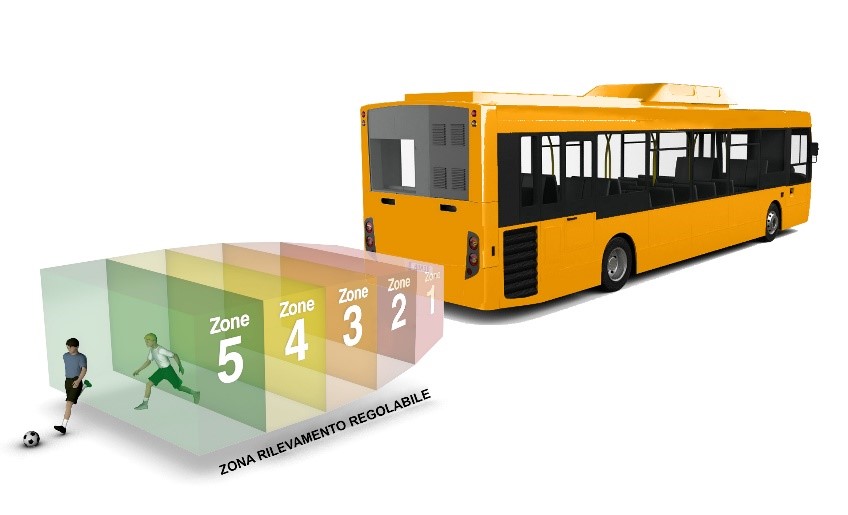 Conforme alla normativa UNECE R151, si compone di un piccolo display posto in cabina accanto al volante di guida, collegato con un sensore laterale da installare esternamente, che rileva e segnala presenze in un’Area di 70 x 4,5 mt con un’ampiezza di a 180°. Più il pericolo di collisione è prossimo più il sensore lampeggia e dà un allarme acustico, tralasciando oggetti fissi senza generare falsi allarmi.  È a tutela di chi è alla guida e chi è in prossimità durante la svolta