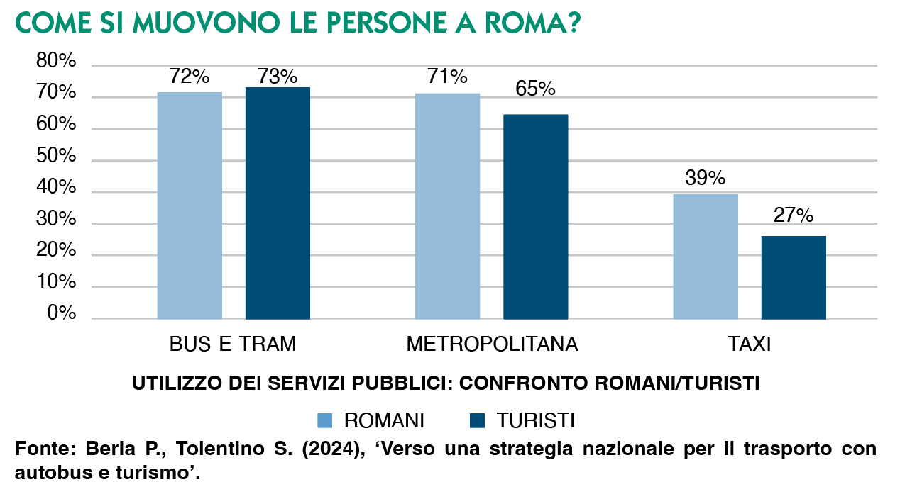 Le differenze di percezione del tpl da parte dei turisti sono determinate da elementi culturali e dalla qualità del servizio nella destinazione turistica ma, «indipendentemente dal paese, il trasporto pubblico è considerato l’elemento più importante della mobilità turistica, più di taxi e simili e dei noleggi». A tal proposito, una recente indagine su 687 turisti nella città di Roma evidenzia come il tasso di utilizzo di bus e tram tra turisti e abitanti locali sia tra loro comparabile.