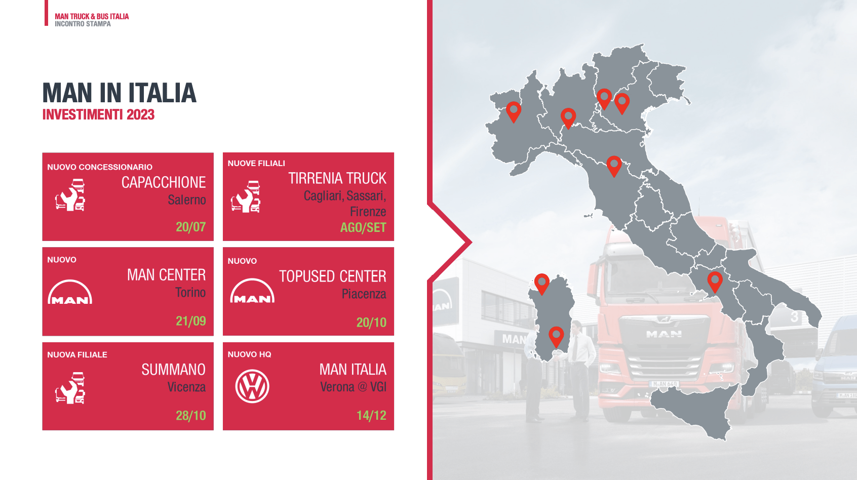 Padrone di casa Marc Martinez, amministratore delegato di MAN Truck & Bus Italia, al timone del Leone tricolore da 18 mesi; 18 mesi di ottimi risultati raggiunti. Queste le sue parole a commento di un risultato, quello del 2023, che ha eletto l’Italia come “MAN market of the year” tra le diverse filiali europee del Leone bavarese: «Fin dal mio primo giorno in Italia ho capito immediatamente l’enorme potenziale che questo mercato ha per MAN e, grazie al duro lavoro e all’impegno di tutti, siamo riusciti fin da subito a rafforzare la nostra presenza sul territorio e a dimostrare ai clienti la nostra affidabilità e la nostra capacità di mettere a loro disposizione soluzioni di trasporto efficienti, sostenibili e convenienti. Sono convinto che con queste basi MAN giocherà un ruolo da protagonista anche in futuro e saprà accompagnare al meglio gli operatori del settore lungo il percorso della transizione energetica».