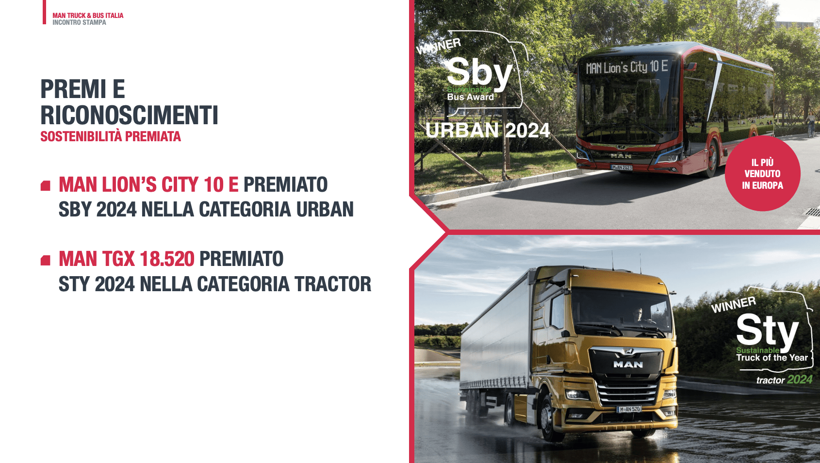 Lato bus, infatti, il 2023 di MAN si è chiuso con 346 autobus&coach venduti (considerando anche il brand Neoplan) nello Stivale. Un risultato più che soddisfacente che viaggia a braccetto con quello dei 785 e-bus targati in Europa, numero che ha portato il Leone sul gradino più alto del podio (sono più di 1.000 in tutto il mondo). Risultati preziosi, preziosissimi, ai quali si somma la vittoria nella categoria “Urban” del Sustainable Bus Awards 2023 con il MAN Lion’s City 10 E.