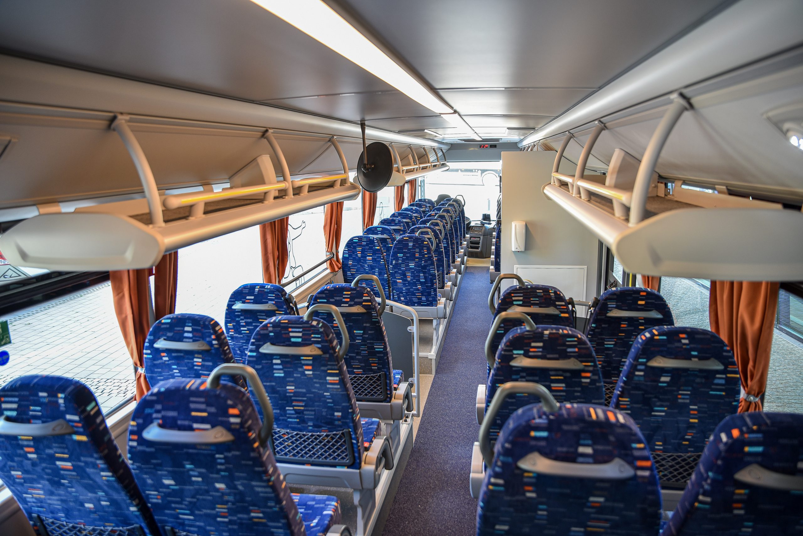 L’abitacolo del MAN Lion’s Intercity può essere allestito in modo flessibile a seconda delle richieste dei clienti. Si parte dalla normale configurazione base come scuolabus con sedili semplici, o come autobus interurbano con rialzo intercambiabile, elevatore idraulico nella scala posteriore per il trasporto di massimo due passeggeri su sedia a rotelle e vani portaoggetti aperti. Il Lion’s Intercity “a doppio uso” completamente equipaggiato, con specifico allestimento da parte del MAN Bus Modification Center di Plauen, può trasformarsi eventualmente anche in un veicolo per lunghe distanze grazie alla presenza di un bagno davanti alla seconda porta, vani portaoggetti e utili tendine sui doppi vetri. Al posto del vano ripostiglio di serie, su richiesta è possibile integrare nella postazione di guida anche un frigorifero da 41 litri. L’interno, con un’altezza di 2.230 mm, è luminoso e di facile manutenzione. I sedili regolabili, del tipo “Intercity Lite”, sono sempre montati su rialzi per permettere alle persone più anziane di alzarsi facilmente e offrire spazio ai passeggeri.