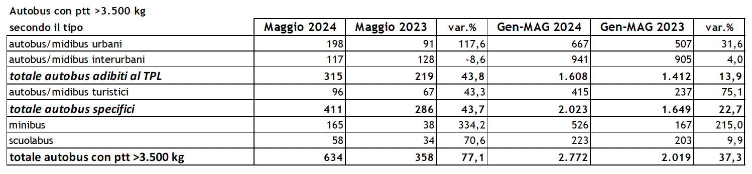 Il mercato degli autobus con ptt superiore a 3.500 kg totalizza a maggio 2024 634 nuove unità, con un incremento del 77,1% rispetto a maggio 2023, secondo i dati Anfia (qui quelli relativi al precedente mese di aprile)