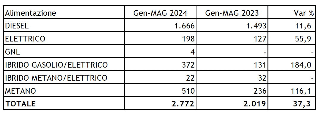 Secondo l’alimentazione, la quota di mercato degli autobus alimentati gas è del 18,5% a gennaio-maggio 2024 (contro l’11,7% dei primi cinque mesi del 2023), mentre gli elettrici, ibridi gasolio/elettrico e ibridi metano/elettrico rappresentano il 21,4% (14,4% a gennaio-maggio 2023).