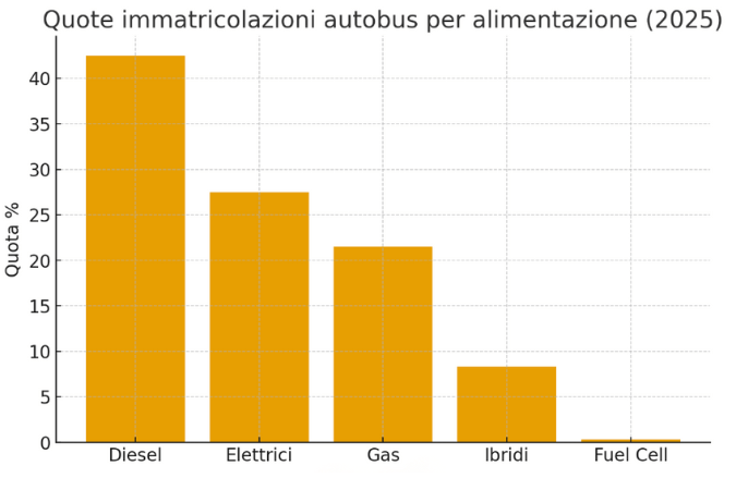 Infine, lo 0,3% è rappresentato dai 7 autobus Fuel Cell a idrogeno.