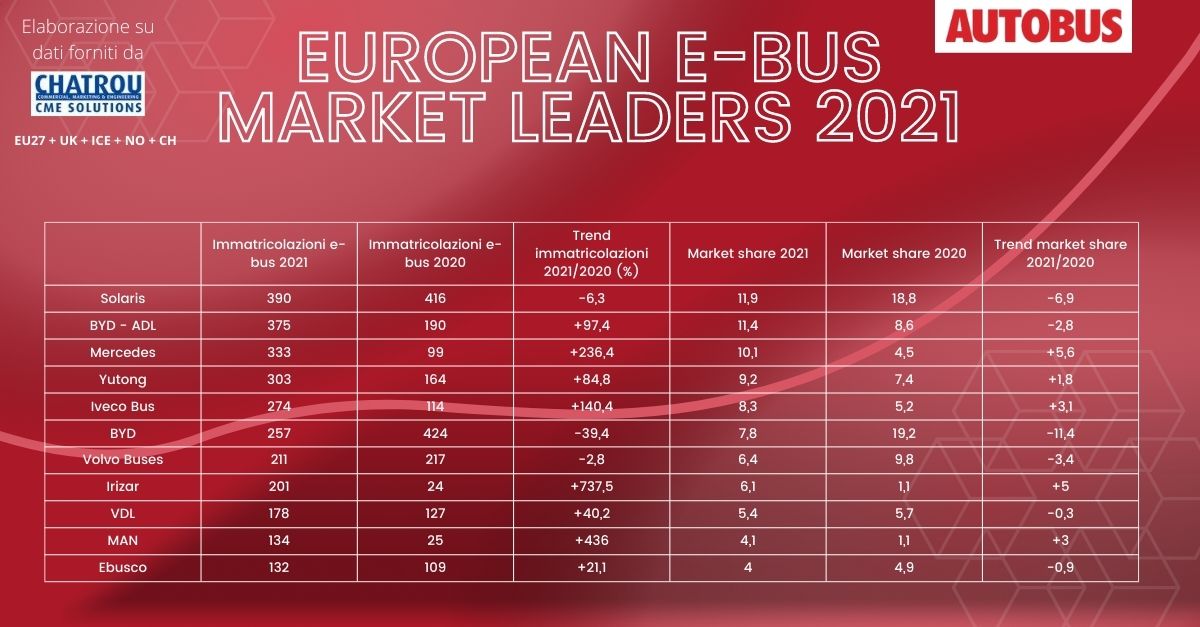 L’azienda in più rapida crescita in termini di unità consegnate, comunque, è Irizar e-mobility: le immatricolazioni sono schizzate a +700% nel 2021 sul 2020 (da 25 a 201). Anche MAN è in crescita, con 134 consegne che rappresentano un +400% sul 2020. Resta nelle retrovie, nonostante il grande clamore generato da iniziative come la quotazione in borsa e la consegna dei primissimi modelli 3.0, è Ebusco, che perde un punto di quota di mercato (5% nel 2020, 4% nel 2021) pur aumentando leggermente i volumi. Resta indietro (come nel 2020) anche VDL, leader di mercato nel segmento fino al 2019.