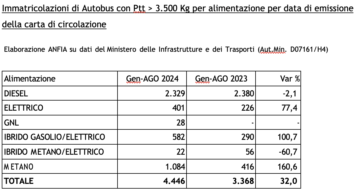 Nei primi otto mesi del 2024, i libretti di autobus rilasciati sono 4.446 (+32% rispetto a gennaio-agosto 2023). Nel cumulato tutti i segmenti presentano una variazione positiva: +144,9% i minibus, +44,6% gli autobus e midibus turistici, +17,6% gli scuolabus e +15,4% gli autobus adibiti al trasporto pubblico locale.
