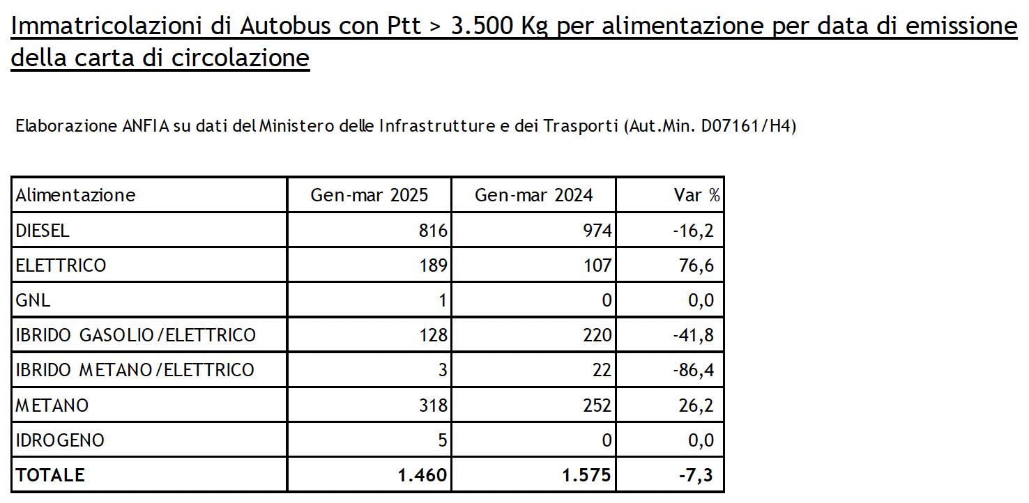 Di seguito, l’analisi dell’Anfia che prende in considerazione anche gli autobus dalle 3,5 tonnellate di ppt in su, quindi non solo quelli sopra le 8 ton.