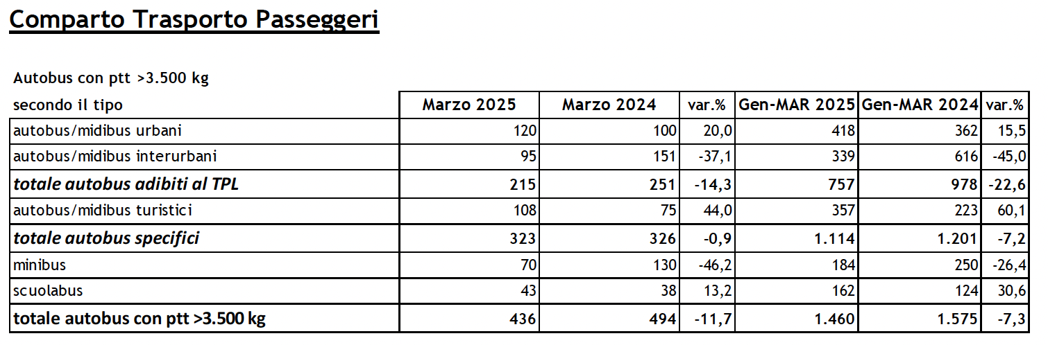 «Il mercato degli autobus con ptt superiore a 3.500 kg totalizza a marzo 2025 436 nuove unità, con un decremento dell’11,7% rispetto a marzo 2024. Nel terzo mese dell’anno, due comparti su quattro si mantengono negativi: calano a doppia cifra i minibus (-46,2%) e gli autobus adibiti al TPL (-14,3%). Performance positiva, invece, per gli autobus e midibus turistici (+44%) e gli scuolabus (+13,2%).