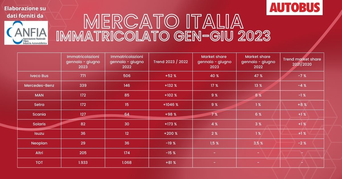 Un trionfo? Lasciamo parlare i numeri: 1.933 autobus immatricolati contro i 1.068 del primo semestre 2022. Interurbani sempre sugli scudi: coprono metà dell’immatricolato. Per il turistico la crescita è del 50 per cento.