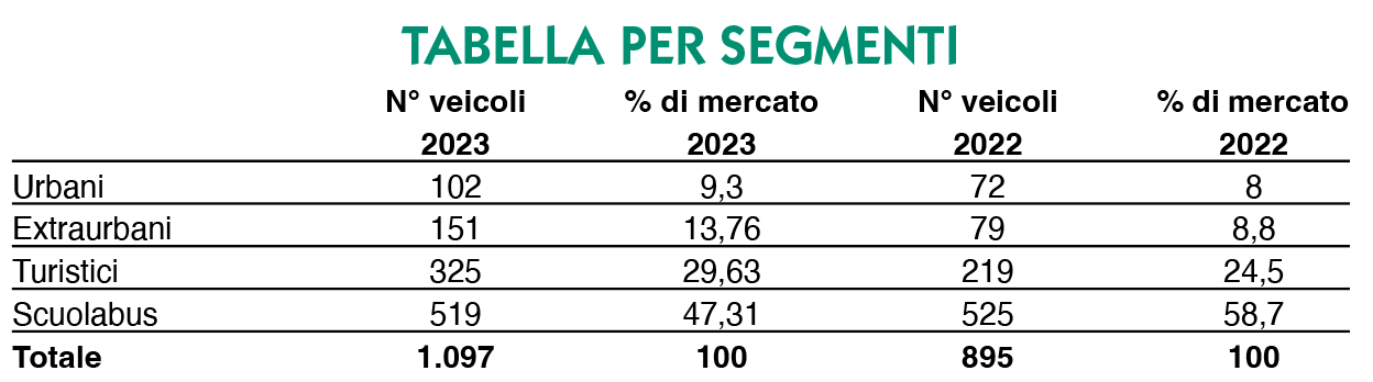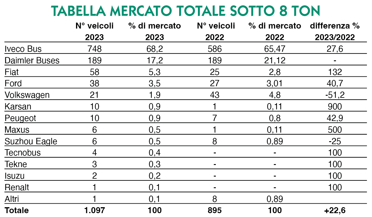 Infatti, stando alla banca dati Anfia, il mercato del bus italiano sotto le 8 tonnellate segna 1.097 nuove targhe, +22,6 per cento sul 2022 (quando il pallottoliere si fermò ‘in collina’, a 895 unità).