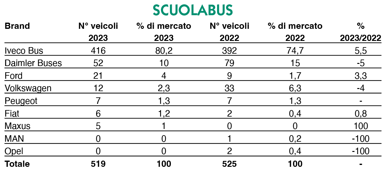 Praticamente metà dell’immatricolato – 519 su 1.097 – è fatto dagli scuolabus. Qui Iveco Bus conferma ulteriormente la leadership con 416 mezzi e un market share dell’80,2 per cento. A distanza siderale Mercedes-Benz con 52 e Ford con 21.