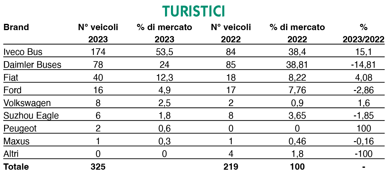 Sono invece 325 i mezzi immatricolati per servizi turistici, di cui 174 Iveco, 78 della Stella di Stoccarda e 40 Fiat.