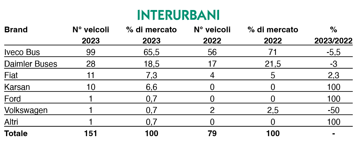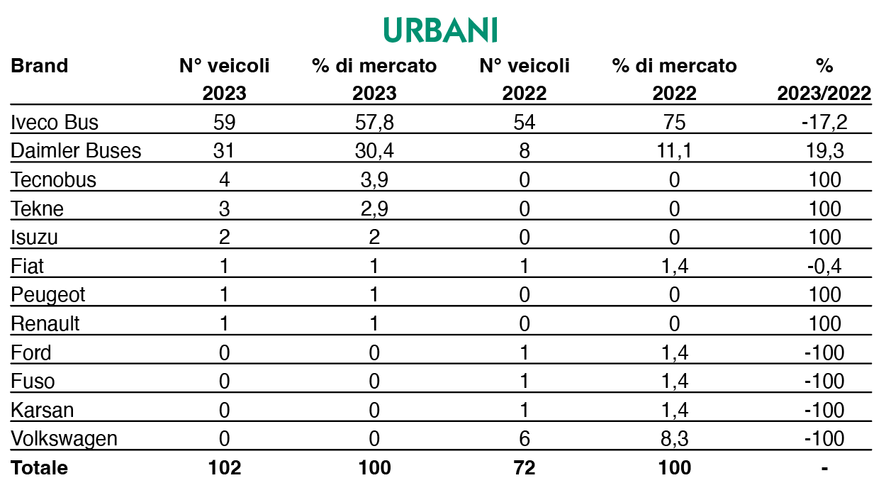 Seconda piazza per Daimler Buses: Mercedes–Benz ha confermato i 189 veicoli del 2022, pari a una fetta del 17,2 per cento. Terzo gradino per Fiat: 58 mezzi (erano 25 l’anno scorso), che valgono il 5,3 per cento del totale.