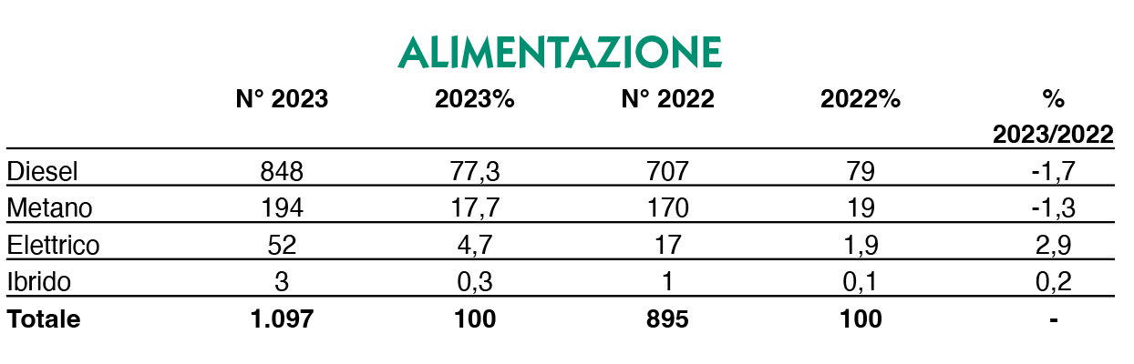 Domina, anzi stradomina il motore a combustione interna diesel, con 848 veicoli sui 1.097 totali. Sono 194, invece, i mezzi a metano, tutti targati Iveco Bus.