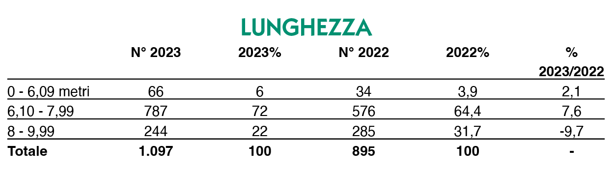 787 dei 1.097 totali si collocano tra i 6,10 metri e i 7,99; 244, invece, dagli 8 ai 9,99. Appena 66, infine, quelli fino a 6,09 metri.