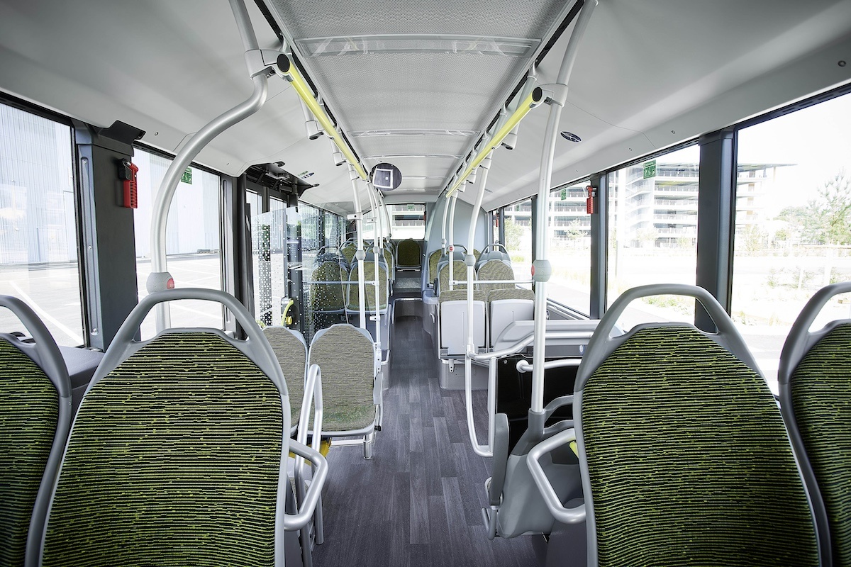 A bordo sono possibili da quattro a sei pacchi batteria. Dato che ciascuno di essi ha una capacità di 98 kWh, la capacità della batteria può variare da 392 a 589 kWh. “Cinque pacchi batteria ad alta tensione con una capacità energetica totale di 491 kWh, distribuiti sul tetto (tre pacchi) e sulla parte posteriore (due pacchi), assicurano un’autonomia adeguata per l’autobus a due porte”, dichiara l’OEM.