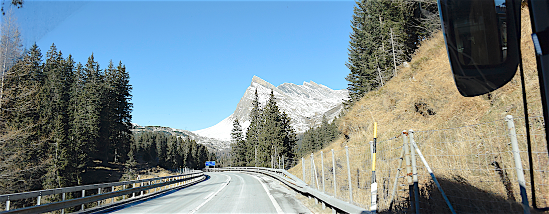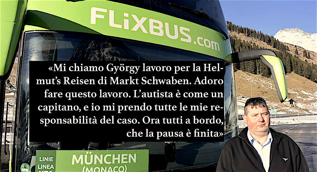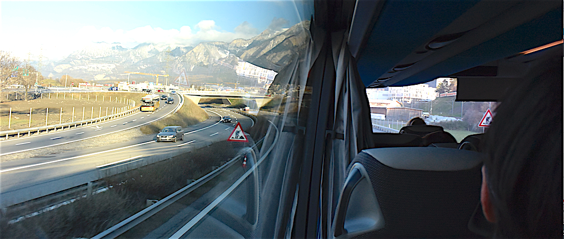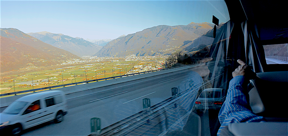 L’autobus da 81 posti accoglie per questo viaggio 35 persone, per lo più straniere. Si sonnecchia, si legge, si mangia all’interno di un Setra che scivola senza problemi sull’asfalto svizzero. Merito anche del sapiente piede di György. Il silenzio colpisce. Anche le telefonate dei passeggeri sono sopportabili e ci fanno dimenticare le urla tipiche del Freccia Rossa. Peccato per il wifi, che qui non funziona.