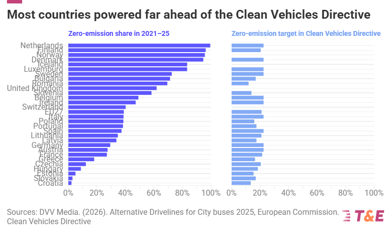 I dati cumulativi sulle vendite dal 2021 mostrano che quasi tutti gli Stati membri hanno raggiunto gli obiettivi di approvvigionamento di veicoli a zero emissioni fissati nella prima fase della Clean Vehicles Directive, che copriva il periodo dal 2 agosto 2021 al 31 dicembre 2025. Gli obiettivi nazionali variavano da almeno il 13,5% in Croazia al 22,5% nella maggior parte degli Stati membri.