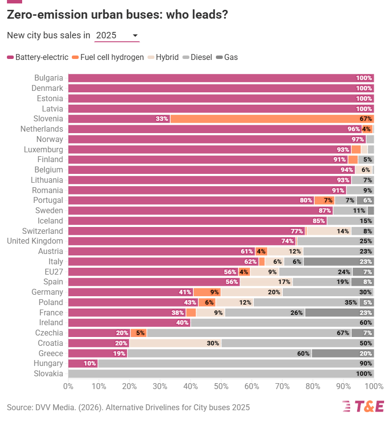 Cinque Stati membri dell’UE hanno registrato una quota del 100% di autobus a zero emissioni nelle nuove vendite di autobus urbani nel 2025: Bulgaria, Danimarca, Estonia, Lettonia e Slovenia. Altri sei Paesi hanno superato una quota ZE del 90%: Paesi Bassi, Lussemburgo, Finlandia, Belgio, Lituania e Romania, si legge nel rapporto redatto dal Principal Researcher per i veicoli commerciali Max Mollière.