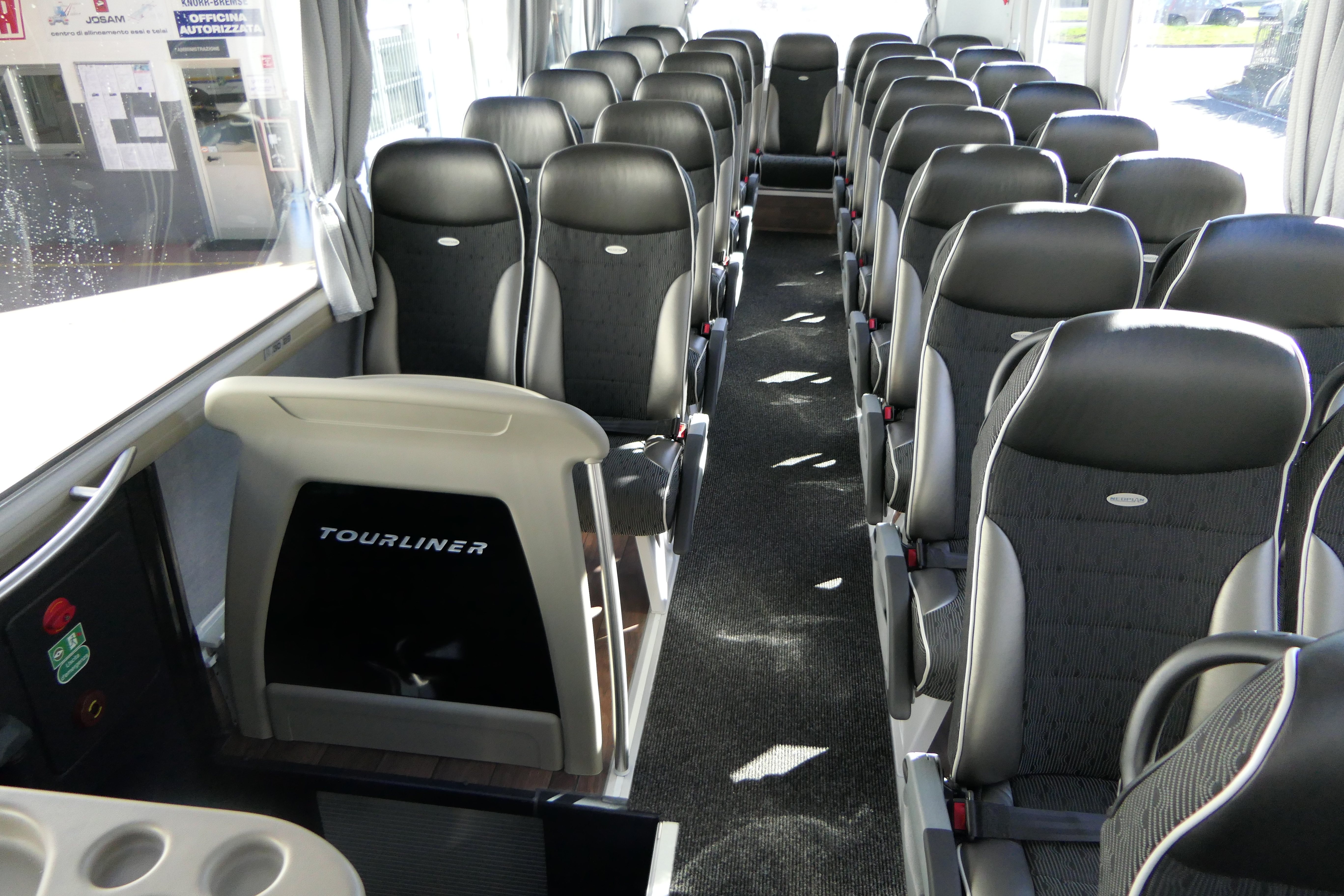 Il modello oggetto del tour italiano è il primo Neoplan Tourliner venduto in Italia, un due assi che la Brubus di Firenze ha fatto subito suo optando per la versione da 51 posti a sedere più i due di servizio (si arriva sino a 55 posti con bagno più piccolo). A muovere il Neoplan Tourliner pensa il sei cilindri da 12,4 litri da 460 cavalli (20 in più della versione precedente) che lavora in tandem con l’Astronic che ora si fregia di un intarder migliorato.