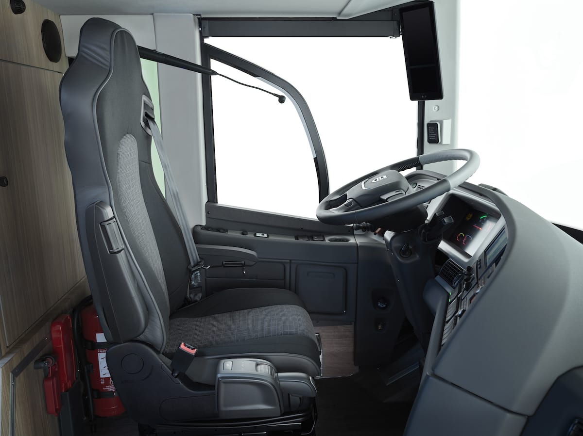 L’abitacolo del guidatore è spazioso e rialzato, garantendo maggiore sicurezza e una vista completa del traffico circostante. L’autobus è dotato di sistemi di assistenza alla guida come Driver Alert Support, Lane Keeping Support e Collision Warning con frenata di emergenza, freni a controllo elettronico, sistema di stabilizzazione e controllo dello slittamento. Un sistema di sospensioni ulteriormente sviluppato in combinazione con un peso corporeo ridotto si traduce in un baricentro basso e un’eccellente stabilità su strada.