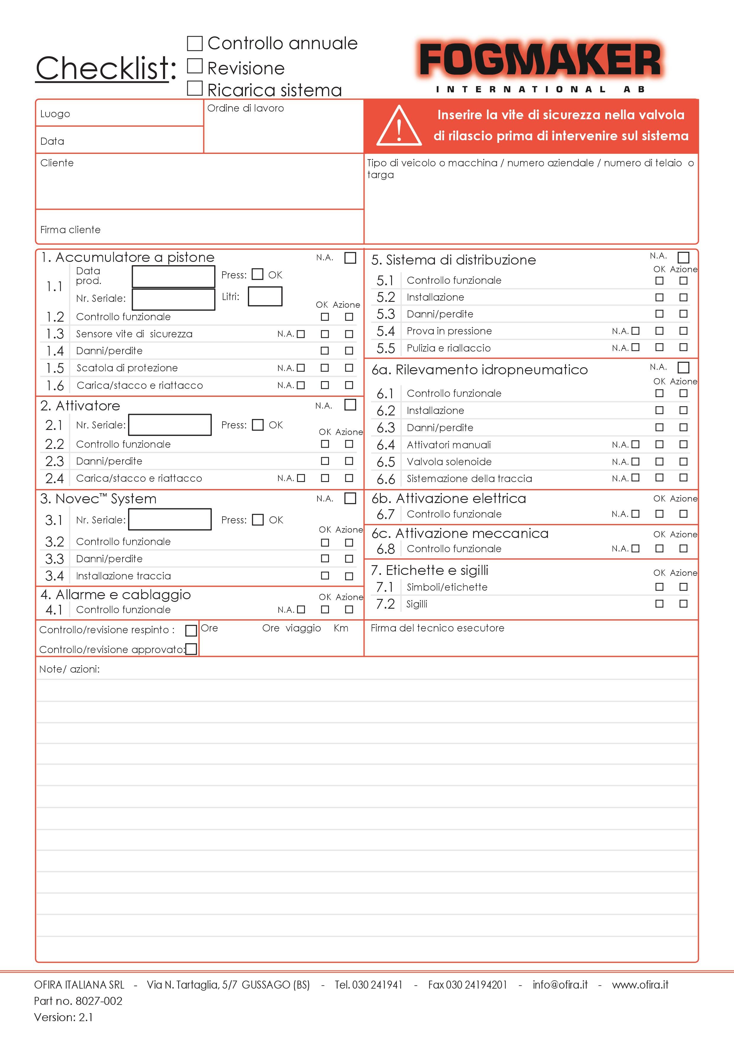 Ogni cinque anni è necessario smontare la bombola principale, quella che contiene il liquido estinguente, e la bombola più piccola dell’attivatore. Entrambe devono essere inviate ad Ofira per effettuare la revisione, che si rende necessaria in quanto le proprietà chimico/fisico del liquido estinguente non sono più efficaci. «L’operazione di revisione è svolta nei laboratori di Ofira Italiana con personale adeguatamente formato da casa madre Fogmaker. Per consentire un fermo macchina il più breve possibile, Ofira Italiana effettua un programma di anticipo/scambio bombole, già revisionate – sempre Rebuffoni -. Così l’utente, prima di smontare le bombole in scadenza ed inviarcele, riceve quelle già revisionate da montare sul veicolo: un’operazione che richiede un’ora circa». Le conoscenze necessarie a svolgere l’operazione di smontaggio e rimontaggio vengono fornite dai tecnici di Ofira Italiana e dalla sua rete di assistenza nel corso della formazione fornita alle officine autorizzate oppure se necessario all’azienda di trasporti. La periodicità è quinquennale: «Considerando una vita media di un autobus di 15 anni, la revisione viene effettuata due volte nell’arco della sua vita».