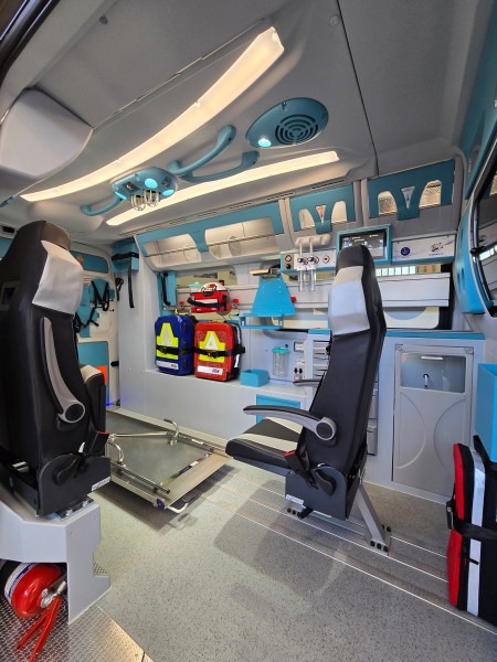 Olmedo ha sviluppato per MAN TGE l’allestimento QTX-M, una soluzione top di gamma che risponde alle più alte aspettative del settore. Realizzato in poliuretano strutturale spruzzato, offre prestazioni superiori in termini di resistenza, sicurezza e comfort. La superficie soft-touch contribuisce a ridurre i rischi di lesioni per il personale medico e i pazienti, migliorando la sicurezza durante il trasporto.