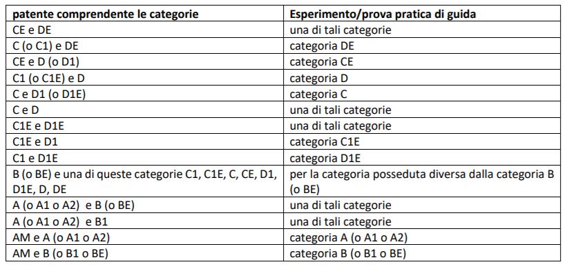 La prova sarà calibrata sulla categoria di patente posseduta dall’interessato. Nel caso in cui la patente comprenda più categorie, l’esperimento di guida si svolgerà secondo le modalità previste per la categoria di patente riportata nella seconda colonna della tabella che segue: