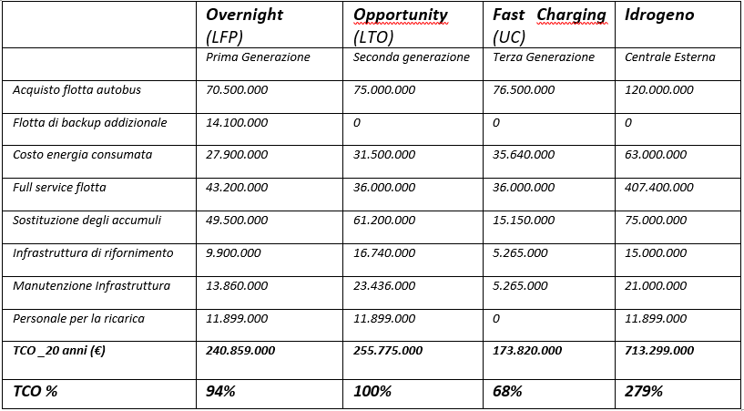 Di seguito un benchmark delle varie soluzioni considerando una flotta di 150 autobus da 12 metri, percorrenti 60.000 Km in 20 anni di esercizio: