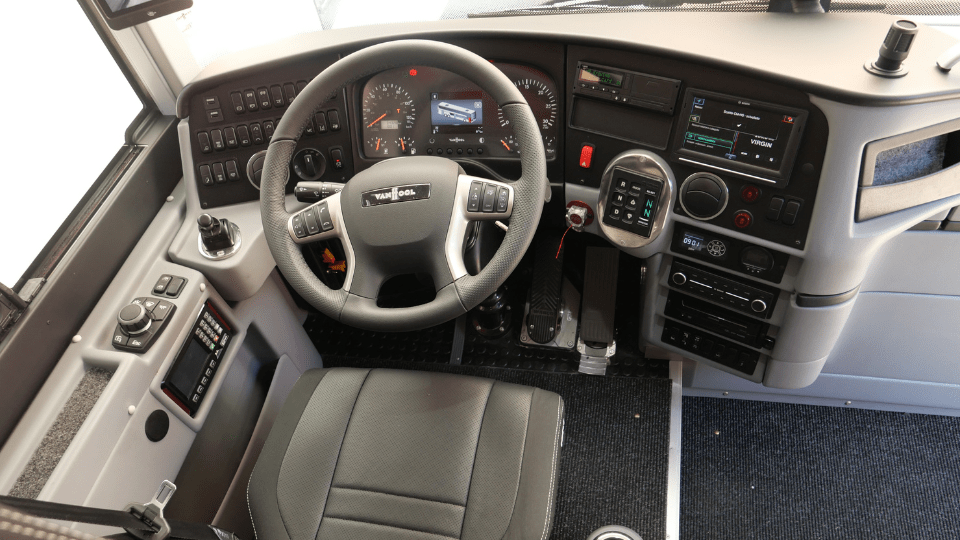 Rimanendo al posto guida, non possiamo ignorare il gradevole cruscotto, provvisto di un grande display centrale a colori e la strumentazione distribuita ai lati, con i comandi del veicolo sul lato sinistro e la gestione di clima e infotainment su quello destro (oltre ai tasti delle porte), integrati dalla pulsantiera del cambio e dal volante multifunzione. Curiosa la scelta di un ‘joystick’ per la gestione dello sbrinamento dei vetri al posto guida, della luce individuale e del frontbox. Poco più sotto, sul pannello laterale, trova infine collocazione la centralina di comando per gli indicatori di percorso